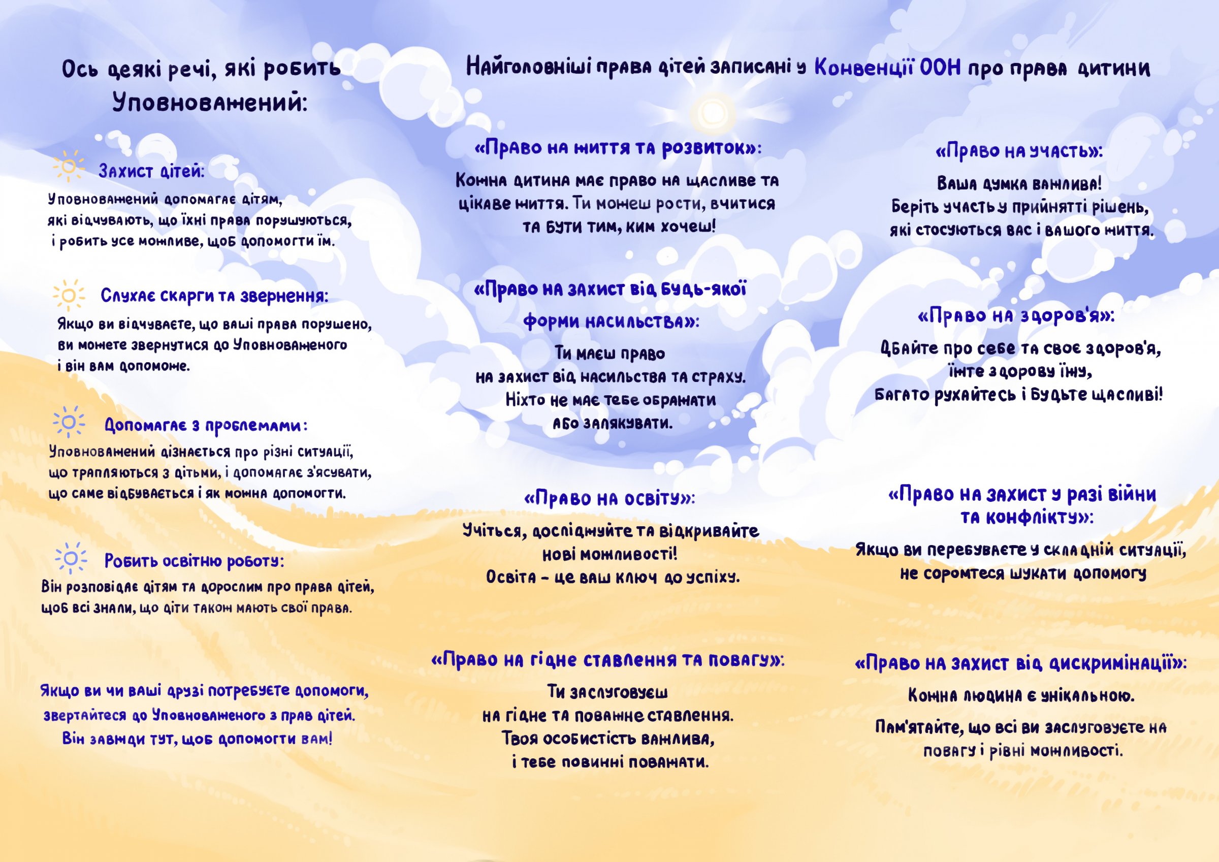 Важливо, щоб кожна дитина знала свої права і могла їх захищати. Уповноважений з прав дитини пропонує новий буклет українською мовою, присвячений правам дітей. У ньому легко і доступно розповідається про права дитини, записані у Конвенції ООН, а також про функції Уповноваженого. Буклет містить цінні поради про те, як діти можуть захистити свої права і куди звертатися за допомогою у разі потреби. За контактами, вказаними у буклеті, діти можуть подавати власні запити безпосередньо. Цей буклет стане корисним джерелом інформації для батьків і дітей з України, допомагаючи їм краще розуміти свої права та можливості.